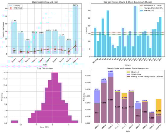 In addition to standard regression metrics, further model validation was conducted using the Coefficient of Variation (CoV), a benchmark error metric widely employed in concrete strength modeling. The CoV provides a normalized measure of prediction error relative to the mean observed strength, enabling direct comparison to the established literature standards []. This approach offers an additional layer of statistical rigor, ensuring that the predictive accuracy of the integrated regression–Markov model is consistent across a diverse range of mix designs and curing intervals.