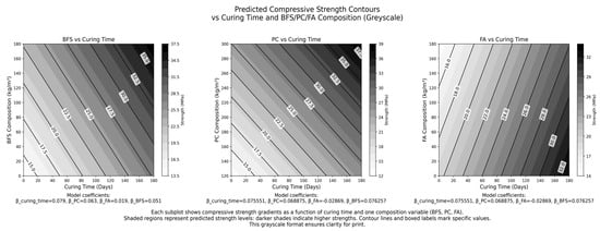 Compressive strength development in concrete is intimately linked to binder composition and curing duration. Portland cement (PC) is essential for early strength gains (7–28 days), which are critical for rapid construction and precast applications. In contrast, FA and BFS contribute to long-term durability and sustainability, though their inclusion can delay early strength development []. Mixes with higher FA content often exhibit lower early strength compared to PC-rich mixes, while BFS becomes more influential at later ages, enhancing long-term compressive strength []. Contemporary sustainability initiatives emphasize the reduction of PC content in favor of FA and BFS, achieving significant reductions in emissions while maintaining target strength levels over time [,]. Previous studies have explored the potential of SCMs in mitigating deterioration and enhancing durability but have generally not integrated dynamic predictive modeling for optimized mix design. Research focused on probabilistic models for long-term performance [] also tends to overlook the need for real-time, adaptive optimization strategies.