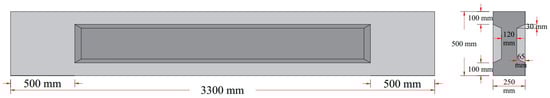 In this study, ten simply supported prestressed post-tensioned I-beams were designed using various unbonded single-strand tendon profiles, in accordance with the ACI 318M-19 code and AASHTO LRFD. All beams had identical geometry, with a length of 3300 mm, a width of 250 mm, and a depth of 500 mm. Solid rectangular end blocks were incorporated at both ends of the beams, as shown in Figure 1.
