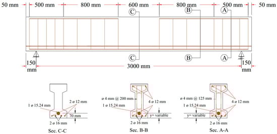 For all tested beams, the primary reinforcement comprised a single seven-wire, low-relaxation strand with a diameter of 15.24 mm (Grade 270). The strand served as the unbonded prestressing steel and was placed inside a plastic duct with an inner diameter of 20 mm. This configuration ensured the proper placement and protection of the prestressing steel during testing, contributing to the overall structural behavior and performance of the beams. The strand eccentricity for all tendon profiles at midspan, or section C-C, was consistently 180 mm from the neutral axis (N.A.). In contrast, the strand eccentricity at sections B-B and A-A varied across different tendon profiles. At the beam’s end anchorages, the eccentricity values ranged from −80 mm to 0 to 80 mm for each tendon profile shape (trapezoidal, parabolic, and harped), while for the straight tendon profile, the eccentricity remained constant at 180 mm from the neutral axis (N.A.). The longitudinal reinforcement consisted of deformed steel bars with diameters of 12 mm. To ensure the beams were designed to resist flexural failure, two longitudinal 16 mm bars were added at the bottom of the beam, and 4 mm steel wires were used for the vertical stirrups. The stirrups were spaced 200 mm along the beam’s length, with a tighter arrangement of 125 mm spacing within the anchorage zone. The reinforcement details for the post-tensioned I-beams, including the end blocks, are provided in Figure 2.