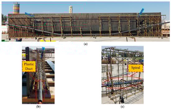 The reinforcement preparation process is shown in Figure 3a. One strand was cut to a length of 3.70 m for every beam. These strands were then placed inside plastic ducts with an inner diameter of 20 mm, which had been pre-embedded in the specimen body, as shown in Figure 3b. Additionally, spiral reinforcement was incorporated into the end block, particularly in the anchorage zone, as illustrated in Figure 3c. This reinforcement arrangement ensured proper prestressing and structural integrity during testing.