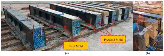 Molds made from steel and plywood were employed to cast the reinforced beams in distinct batches. A total of ten reinforced concrete beams were produced at the Kirkuk Limited Company, Kirkuk, Iraq for Concrete Girders, as shown in Figure 4a. After casting, the specimens were covered with wet cloths to ensure they remained damp. The curing process began after 15 h of casting and continued for a duration of 7 days, as presented in Figure 4b. This curing procedure was crucial to ensuring the proper hydration of the concrete, contributing to the beams’ strength and durability for the subsequent testing.