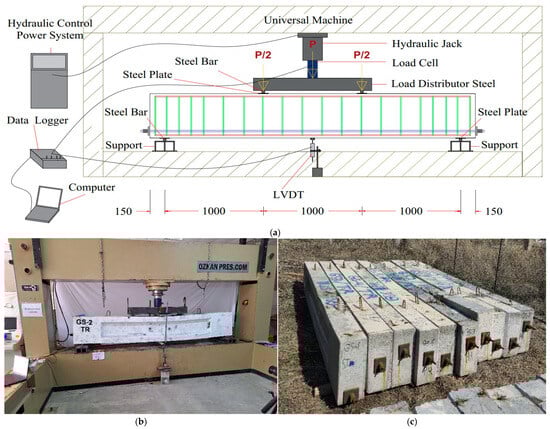 Tested specimens’ preparation: (a) tested setup, (b) testing device, and (c) tested beams.