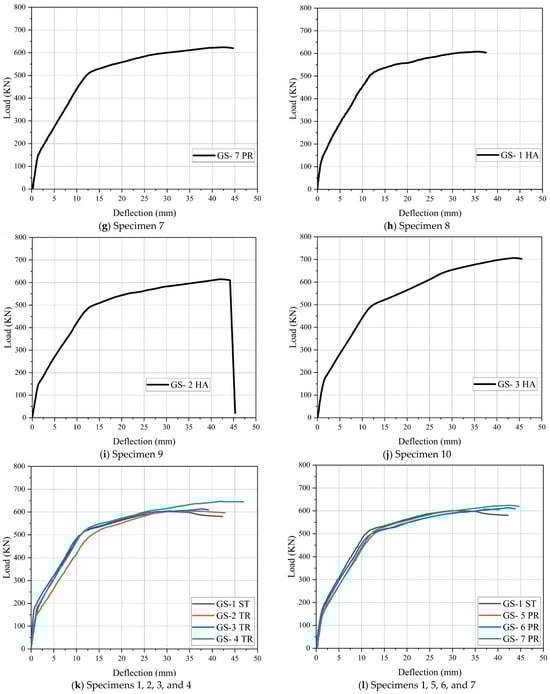 As shown in Figure 8a, the load-deflection curve for the control specimen (GS-1 ST) demonstrated an initial linear response during the elastic stage, where load increased proportionally with deflection. Upon reaching 167.17 kN and 1.36 mm deflection, the first cracks appeared, marking the transition to inelastic behavior in the elastoplastic stage. The load-deflection curve then showed a decrease in slope, indicating reduced beam stiffness due to cracking, with deflection increasing more rapidly than load. As the load continued to rise, the curve displayed a further reduction in slope, transitioning to a plastic response caused by the yielding of the longitudinal reinforcement, which continued until the test concluded. During this phase, the load stabilized while deflection increased sharply. The ultimate load reached 601.17 kN, with a deflection of 30.1 mm, and the Pcr/Pu ratio was 27.81%, as indicated in Table 4.