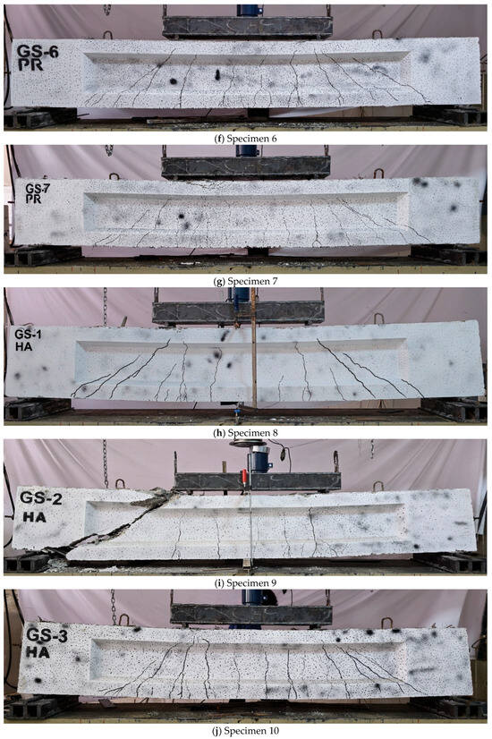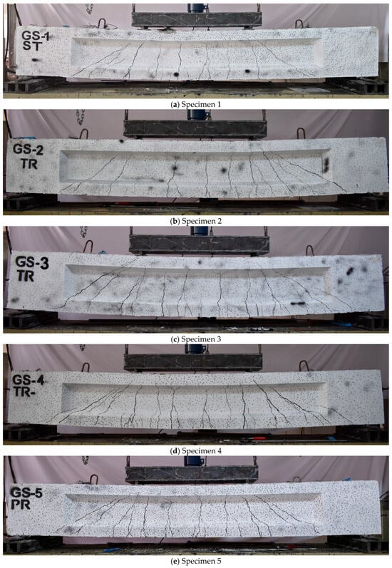 During testing, the cracking loads were recorded when the first oblique cracks appeared in the web, caused by high diagonal tension. As the load increased, these cracks spread diagonally, both upward and downward. This behavior was attributed to the thin web structure combined with high prestressing forces, which intensified the diagonal tension and facilitated crack propagation. The crack patterns and failure modes for each specimen are presented in Figure 9 and Table 4. Web-shear cracks formed in the shear span region of all specimens, initially appearing on either side of the web. In some cases, the first crack became dominant, while in others, cracks from the opposite side grew to prominence. As the load increased, these cracks expanded diagonally in both upward and downward directions, extending further within the shear span. Additionally, some flexural cracks developed from the bottom flange, extending toward the loading points. As the cracks progressed, a significant reduction in the beam’s load-bearing capacity and stiffness occurred, primarily due to the continued growth and propagation of these cracks.