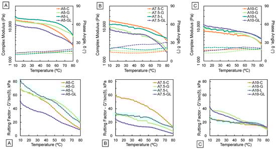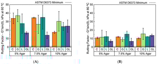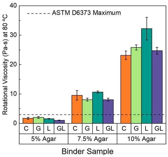 - All 5% w/w agar-based binders passed the rotational viscosity (RV) threshold set by the performance-grade (PG) specification (<3 Pa·s), while all 7.5% and 10% w/w samples exceeded that same threshold. In general, agar-based binders exhibited more viscous behavior than traditional asphalt binders. However, RV testing of agar-based binders was completed at a lower temperature than stipulated by the PG specification (i.e., 80 °C vs. 135 °C). The lower temperature compatibility of agar-based materials indicates the possibility of lower mixing and compaction temperatures and an increase in energy efficiency of production as compared to petroleum-based binder production.