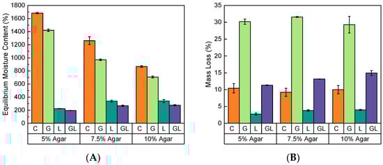 - Moisture diffused rapidly in agar-based binders and the equilibrated moisture content for agar-based samples relative to conditioned mass ranged from 196% to 1682%. Relative to fresh-state sample mass, rehydrated agar-based binders swelled to between 55 and 97% moisture content. Limestone significantly reduced moisture sorption and improved mass loss during testing. However, glycerol plasticizer was found to leach from agar-based binder samples in isothermal sorption testing.
