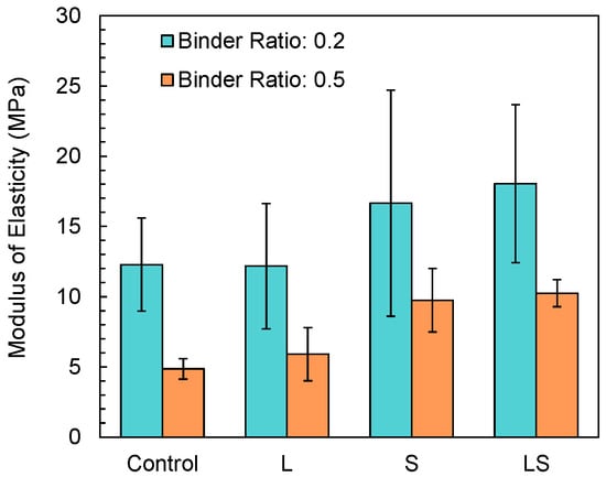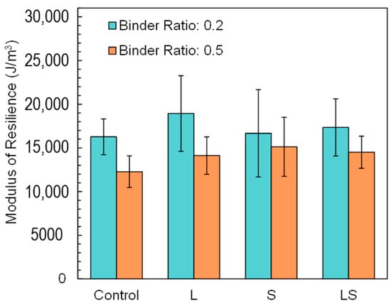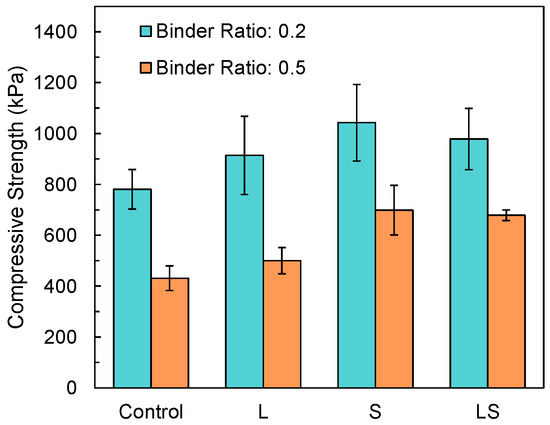 - In mechanical characterization, the compressive strength of samples ranged from 431 to 780 kPa, 500 to 913 kPa, 699 to 1042 kPa, and 679 to 978 kPa for control, L, S, and LS samples, respectively. The average modulus of resilience of samples ranged from 12,275 J/m3 (i.e., sample C-0.5) to 18,934 J/m3 (i.e., sample L-0.2) and the average modulus of elasticity ranged from 4.87 MPa (i.e., sample C-0.5) to 18.03 MPa (i.e., sample LS-0.2). The use of a higher biopolymer content led to increased shrinking stresses and 0.5 binder content samples consistently illustrated lower mechanical properties.