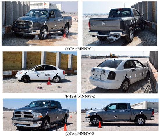 The center of gravity (c.g.) was measured using the Suspension Method []. This method involves suspending the vehicle in three different positions and locating the intersection of the vertical planes passing through the suspension points. For the small car in test MNNW-2, the vertical c.g. position was obtained following the procedures outlined by SAE []. The test vehicles are presented in Figure 4.