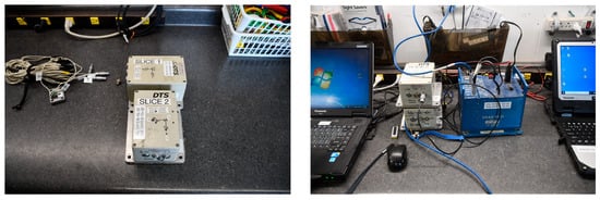 Triaxial acceleration data were collected using SLICE-1 and SLICE-2 systems manufactured by Diversified Technical Systems, Inc. These modular data acquisition units were installed near vehicle c.g., sampled at 10,000 Hz with a range of ±500 g, and were equipped with SAE Class 60 and Class 180 Butterworth filters in compliance with SAE J211/1 []. Data were stored in onboard memory and processed using SLICEWare software and custom Excel tools. Each SLICE unit also included a MICRO Triax ARS angular rate sensor, with a ±1500 deg/sec range for roll, pitch, and yaw. These sensors captured rotational kinematics at 10,000 Hz and were used to compute Euler angles for detailed vehicle motion analysis. A representative photograph of the SLICE-1 and SLICE-2 accelerometer packages is provided in Figure 5.