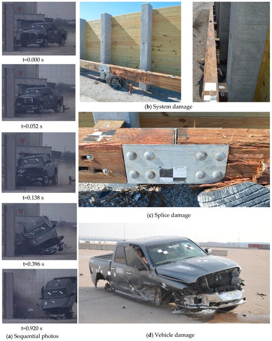 In a third case, the Minnesota Department of Transportation (MnDOT) originally designed a concrete post and wood plank noise wall system for use in urban areas. In 2005, MnDOT and MwRSF collaborated to develop and crash test a version with a glue-laminated timber rubrail, intended for use in locations where the wall is placed within the clear zone and conventional safety devices are undesirable []. This system featured a 24.7 m long glulam timber rail supported by reinforced concrete posts. The rubrail, composed of 222 mm × 343 mm glulam timber sections, was anchored to the post faces and reinforced with cable connections to resist lateral vehicle impacts (Figure 1c). A 1989 kg pickup truck crash test conducted at 99.5 km/h and 25.3° confirmed compliance with TL-3 criteria under NCHRP Report 350. However, this system had not yet been evaluated according to the more stringent MASH 2016 guidelines.