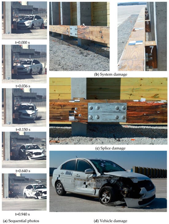 Results from test MNNW-3 results: (a) sequential crash test photos, (b) overall system damage, (c) splice damage, and (d) vehicle damage.