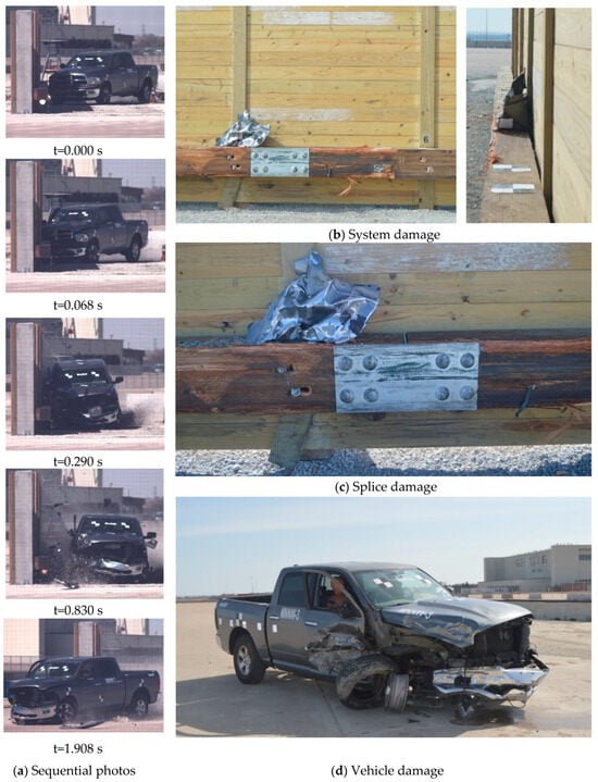 Results from test MNNW-2: (a) sequential crash test photos, (b) overall system damage, (c) splice damage, and (d) vehicle damage.