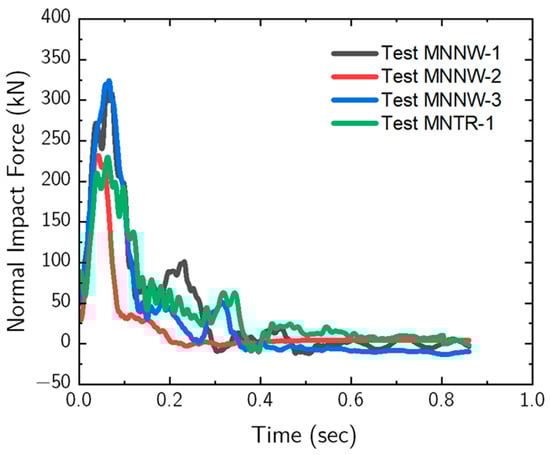 Estimated lateral barrier impact forces for each full-scale crash test. Test MNNW-1 and MNNW-3 involved the 2270P pickup truck with impact severities of 158.9 kJ and 163.3 kJ, respectively. Test MNTR-1 also involved a 2270P pickup truck but was conducted under NCHRP Report 350 criteria with an impact severity of 138.5 kJ. Test MNNW-2 used an 1100C small car and had an impact severity of 59.7 kJ.