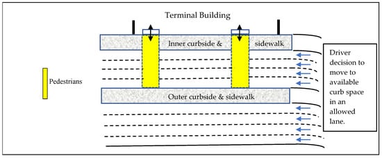 According to the National Academy of Sciences, Engineering and Medicine (NAS), a four-lane cross section is commonly used at airports that allow double parking during peak times []. The two outer lanes enable maneuvering and through movements. At large airports, two parallel curb fronts (i.e., inner and outer curb lanes) are provided, separated by a pedestrian island (Figure 1). Some passenger terminals have the lane configuration of the curbside processor shown in Figure 1, but with three lanes in each parallel curbfront. The arrival curbfront of Pearson Airport Terminal 1 in Toronto is an example [].