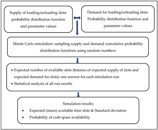The method is implemented in five steps. In step one, the supply of unloading/loading curb time slots are defined using the probability distribution function. Next, a similar step is followed to characterize the demand for curb time slots. In the third step, the Monte Carlo simulation model is activated which uses random numbers to sample supply and demand cumulative probability distribution functions. For running simulations, different random number streams can be defined.