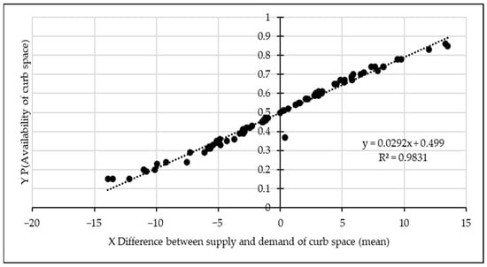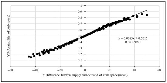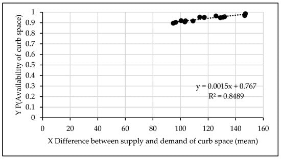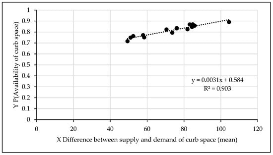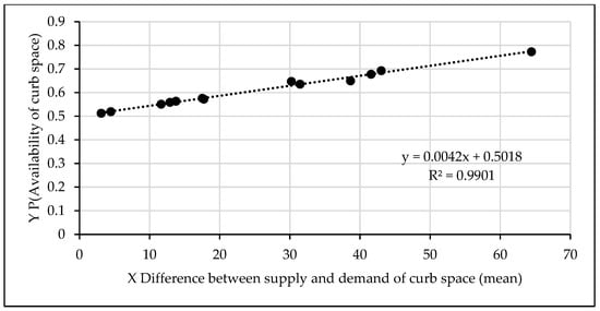 The regression model of the probability of available curb space as a function of the difference in modes (i.e., ϒλ − ϒμ) shows a very high correlation coefficient. The regression model is computed using the minimization of the square of deviations. The Excel software provides results for a number of mathematical forms, including the linear version. The linear model shown in Figure 4 and in other figures appears to be the best fit of the data.