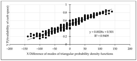 Figure 8 shows the results for all cases that cover the entire range of demand and supply conditions, based on 140 time slots. As expected, the probability values for the availability of curb space are at 0.5 or higher for favourable supply condition. On the other hand, for the unfavourable supply of curb space availability, the probability falls below 0.5. Results for several conditions shown in Figure 8 suggest that LOS F can be encountered due to a lack of availability of curb space. For a selected value of the difference in modes of the triangular probability distribution, the probability of curb space availability is found. Based on the probability value, the LOS is inferred.