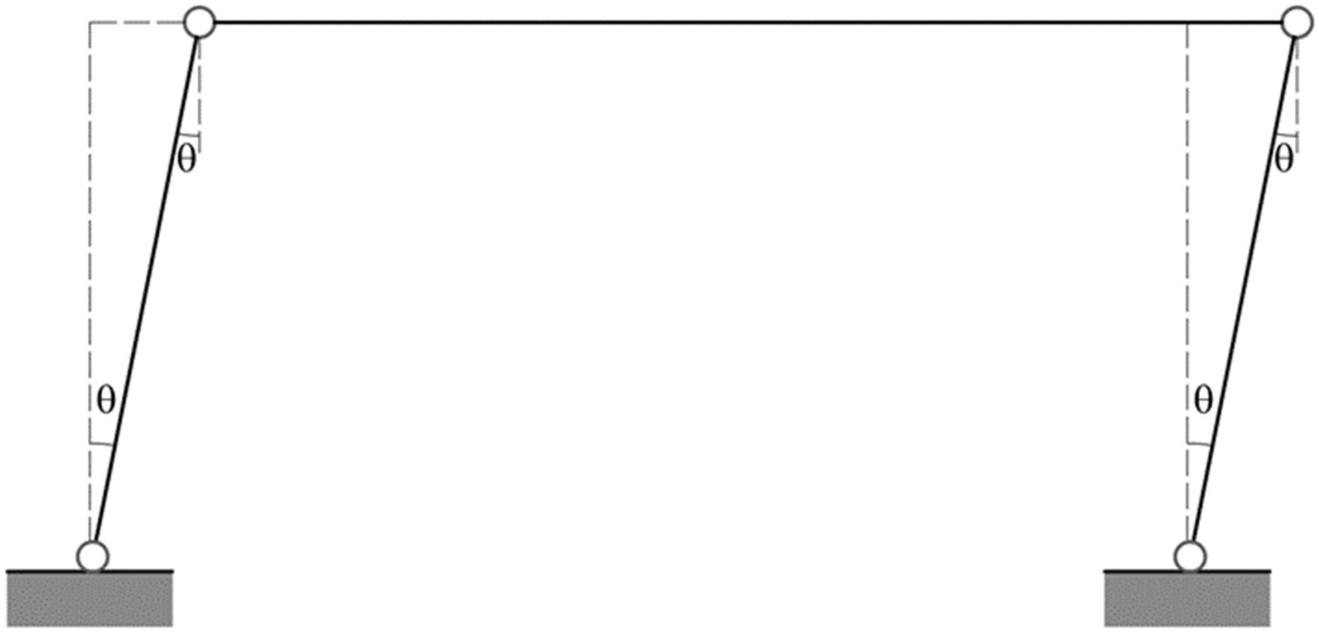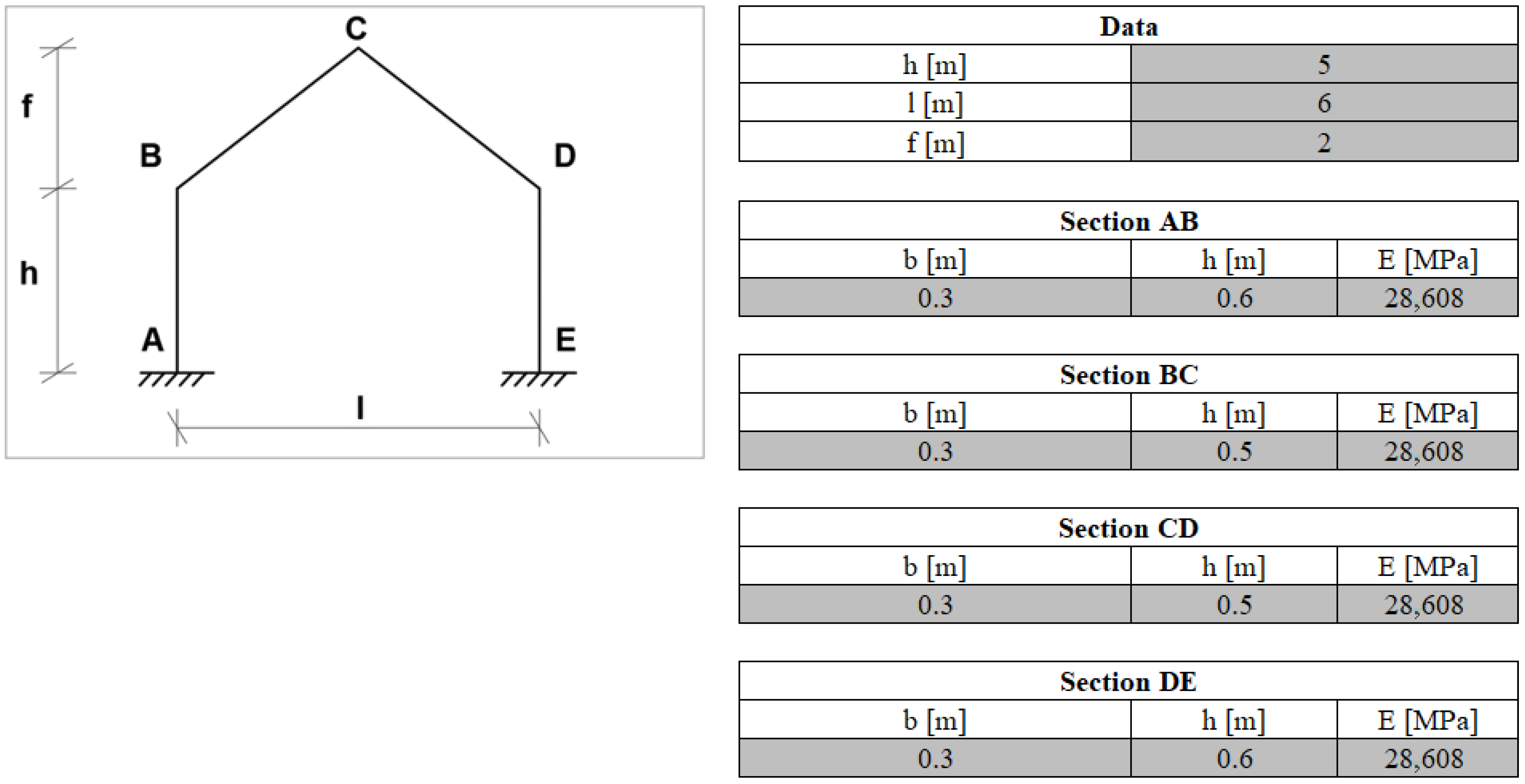 Figure 4 shows a simple portal frame fixed at the base at A and E with pitches inclined by an angle α. It is possible to calculate both stresses and deformations of all the members of the frame [