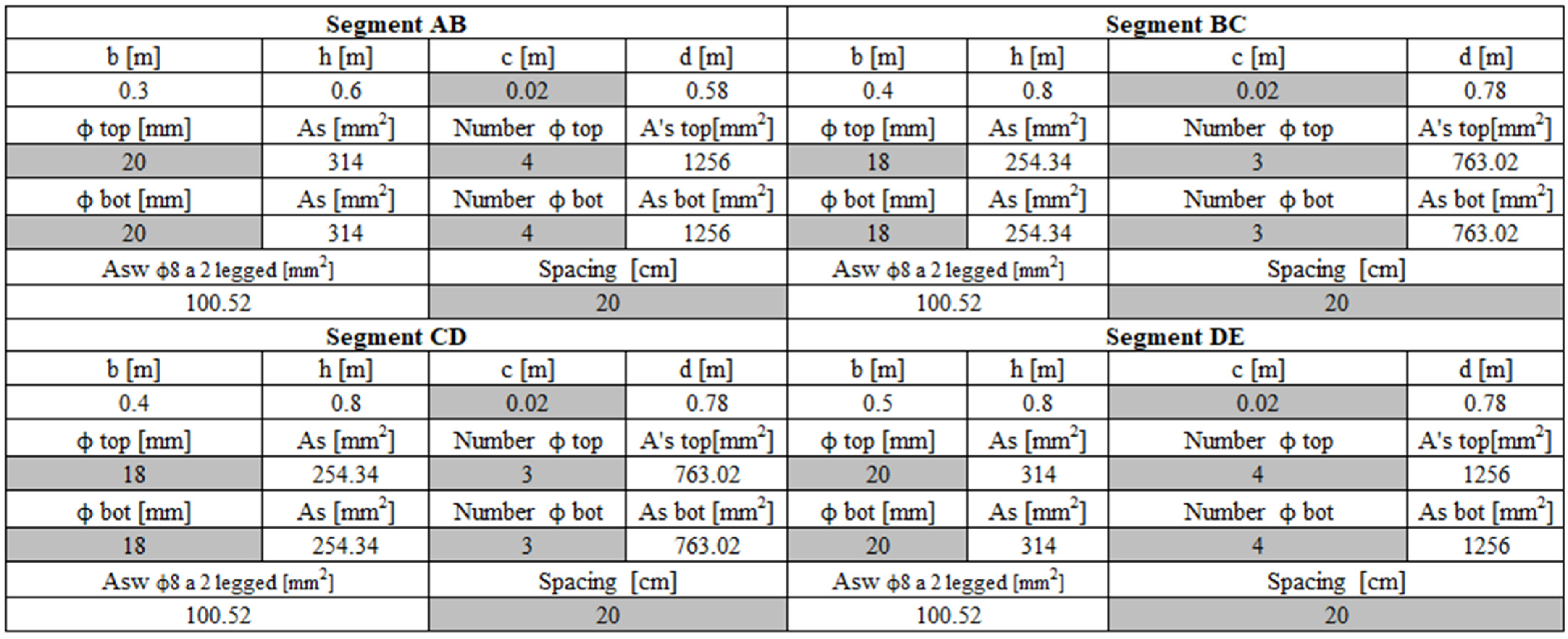 The longitudinal reinforcements (the number of bars and their diameter in each section) and the stirrups (the diameter and pitch of bars) are incorporated. Finally, the concrete cover used in the calculations is specified (