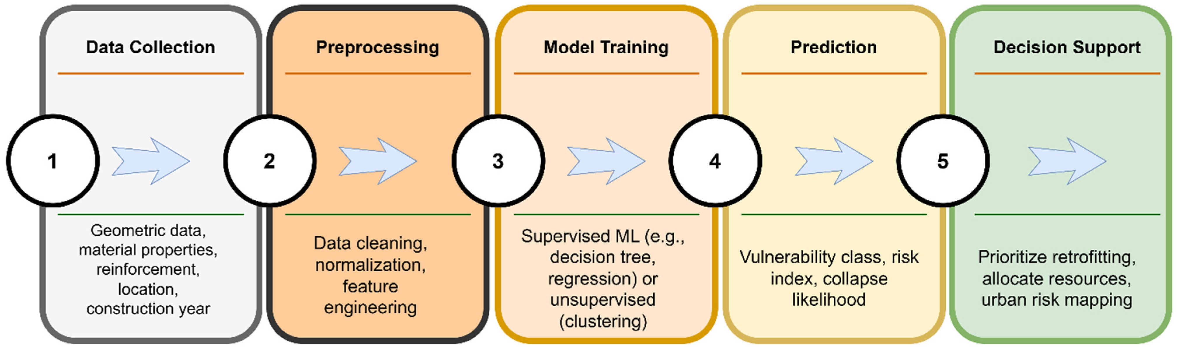 Figure 22. The process begins with the collection of structural and material data, such as geometric dimensions, reinforcement details, and construction age, followed by preprocessing steps like normalization and feature selection. These inputs can then be used to train supervised models (e.g., decision trees, regression algorithms) to predict a structure’s seismic vulnerability index. Alternatively, unsupervised learning (e.g., clustering) could identify typological groups with similar vulnerability patterns.