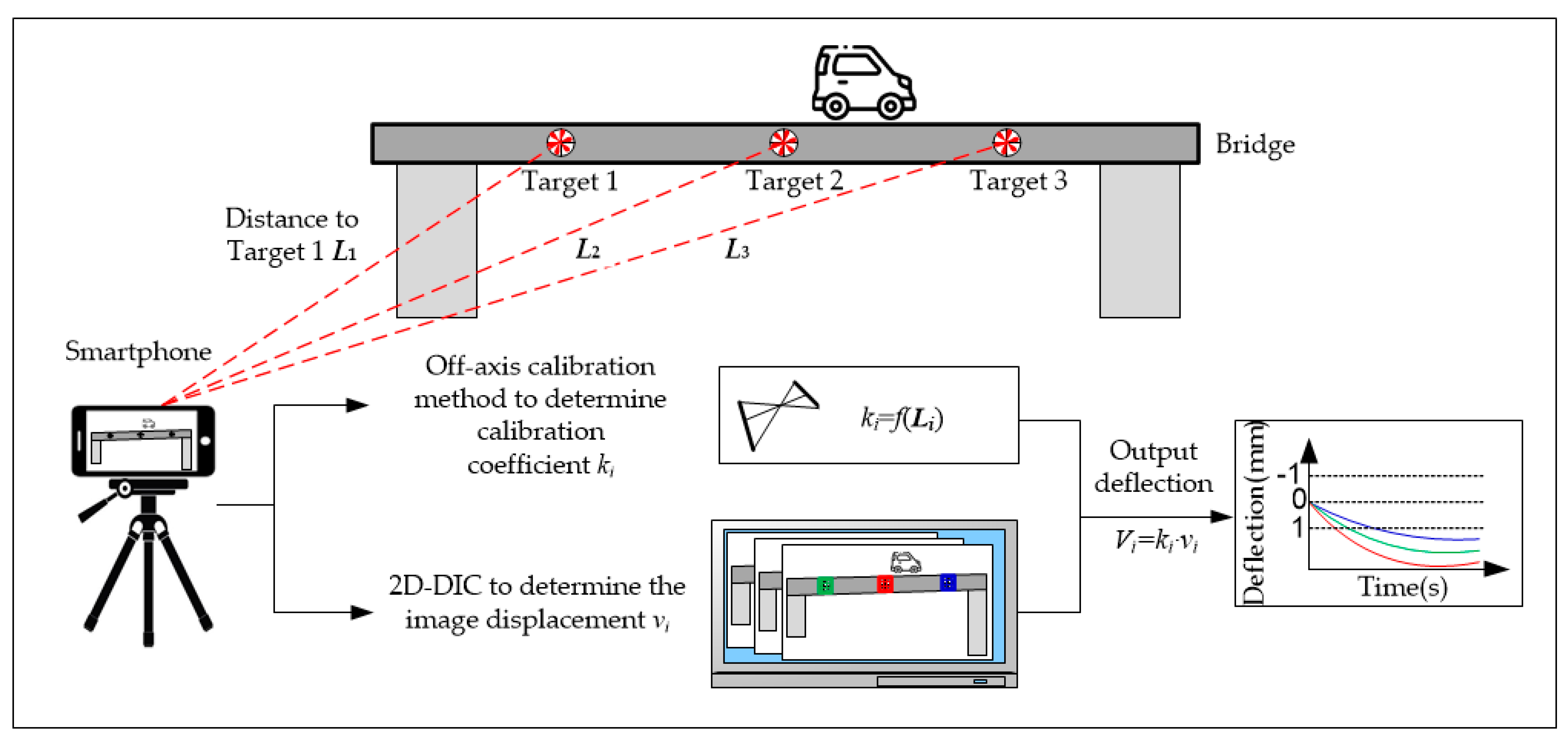 As mentioned above, the two key stages in measuring structural deflection/displacement using a smartphone are the determination of SF coefficients and the calculation of image displacement at each target point. In this work, the well-accepted Inverse Compositional–Gauss Newton (IC-GN) algorithm is used to achieve displacement tracking [22]. For brevity, the principle of the IC-GN algorithm is not repeated here. This work focuses on the calibration of SF at each measurement point. In the imaging model of off-axis DIC, the SF at each measurement point that depicts the relationship between the actual displacement and the image displacement can be expressed as