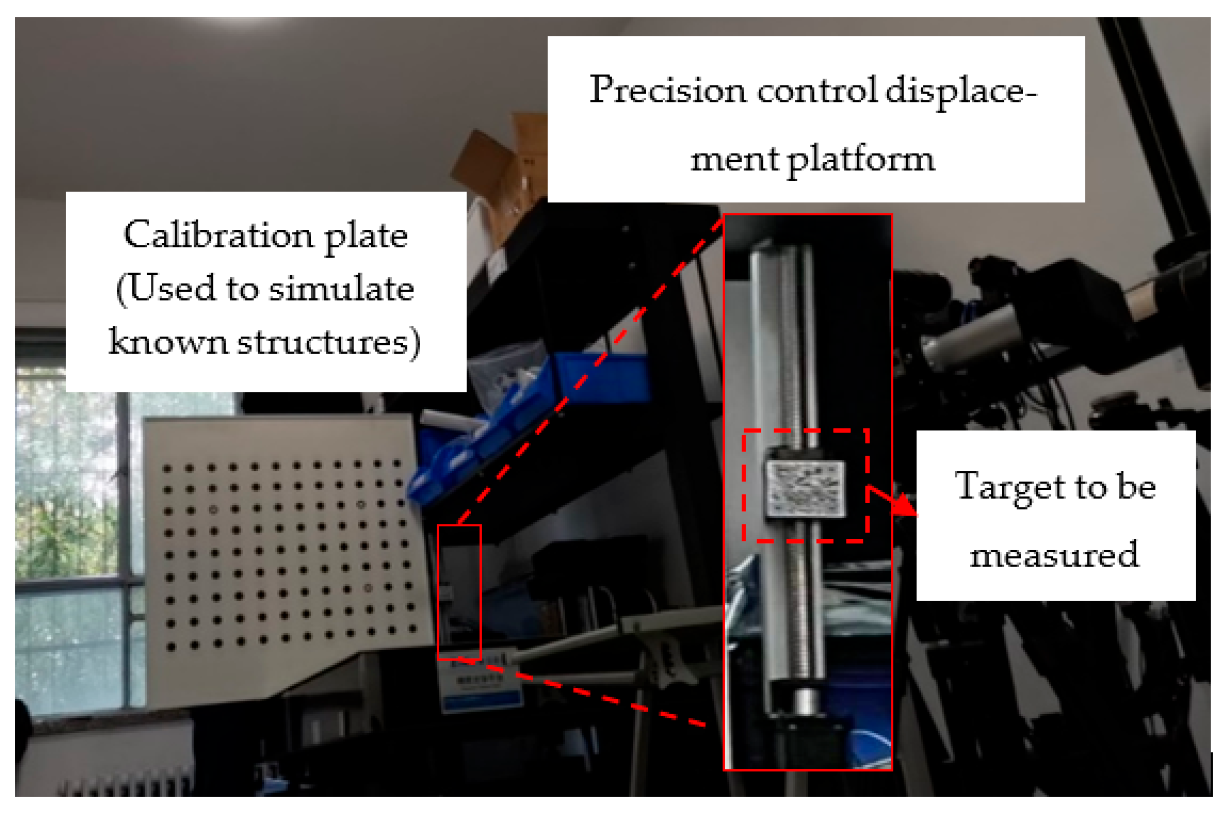 As illustrated in Figure 5, a speckle pattern was affixed to the slider of the precision displacement control platform to serve as the target points for the measurement. The slider was programmed to descend vertically in five discrete steps, with each step corresponding to a 2 mm displacement, culminating in an overall movement of 10 mm. This process was recorded using smartphone recording software (mcpro24fps, version 041aq) at a frame rate of 30 fps. The initial frame from the recorded sequence was utilized as the reference image for subsequent comparison and calculations. The distance between the optical center of the camera and the target points was calculated by integrating plane equation parameters through global optimization, yielding an SF for the target of 4.877 mm/pixel.