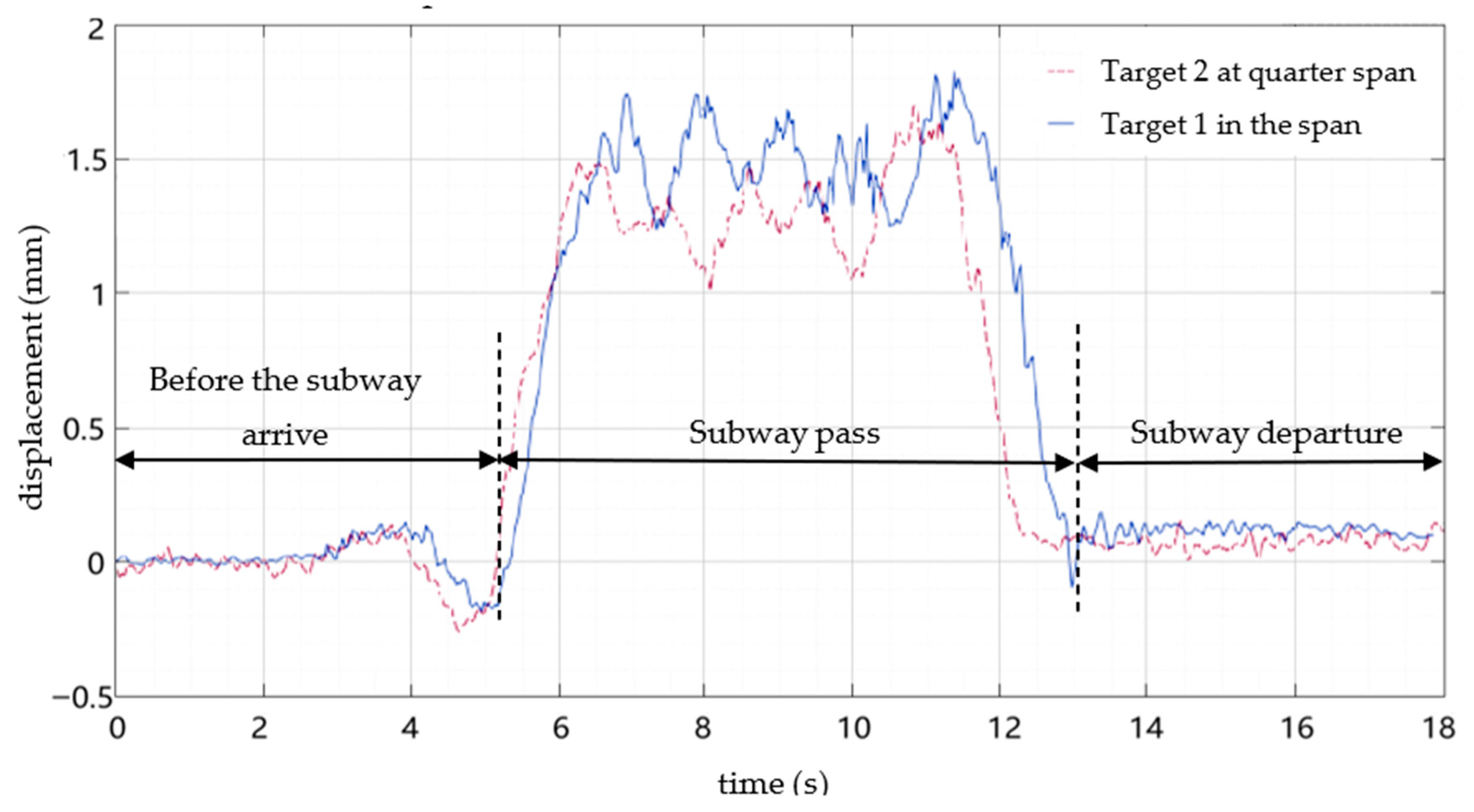 As shown in Figure 8, during the subway’s passage over the bridge, Target 1 exhibits a relatively large displacement with an average value of 1.592 mm, while Target 2 shows an average displacement of 1.213 mm. Notably, as the subway approaches the bridge, both targets exhibit upward movement due to the uneven load distribution across the bridge structure. When the subway is fully positioned on the bridge, an increased deflection is observed near the mid-span. These findings are consistent with actual observations and validate the effectiveness of the method employed in this study for measuring structural displacement.
