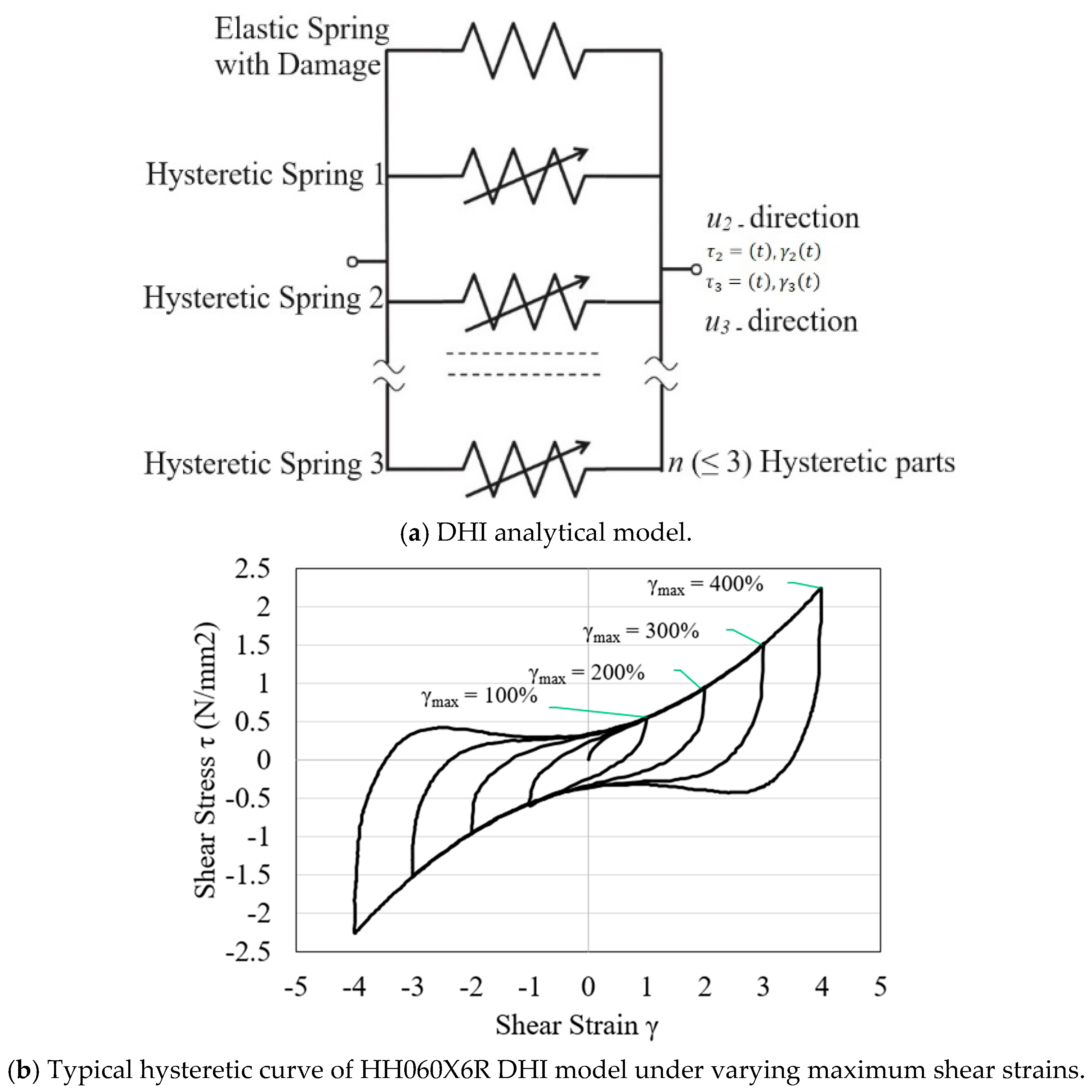 - Masaki, N.; Mori, T.; Murota, N.; Kasai, K. Validation of hysteresis model of deformation-history integral type for high damping rubber bearings. In Proceedings of the 16th World Conference on Earthquake Engineering (WCEE), Santiago, Chile, 9–13 January 2017. [Google Scholar]