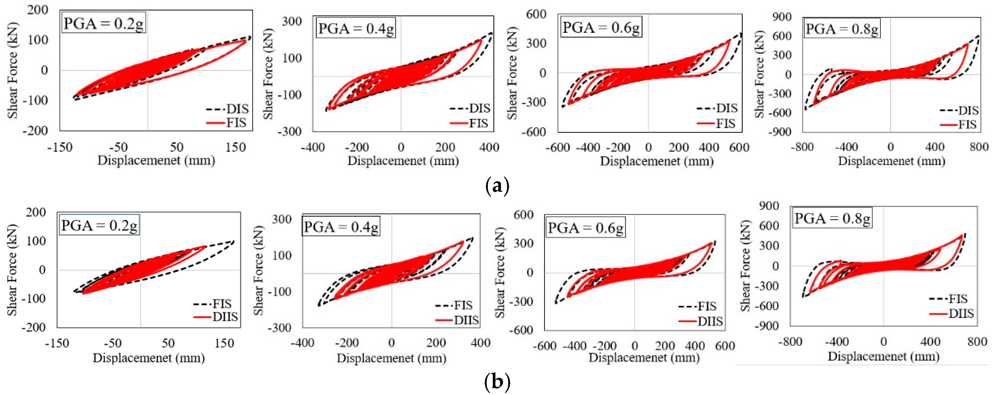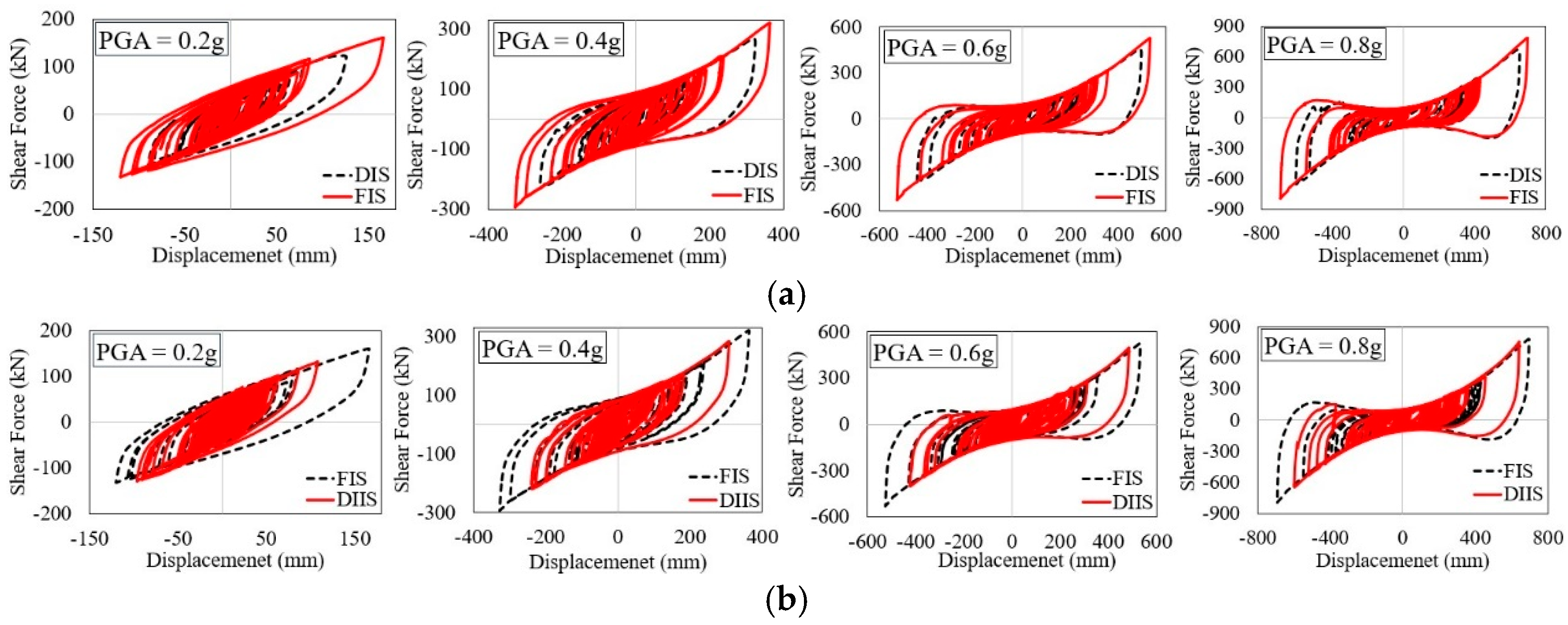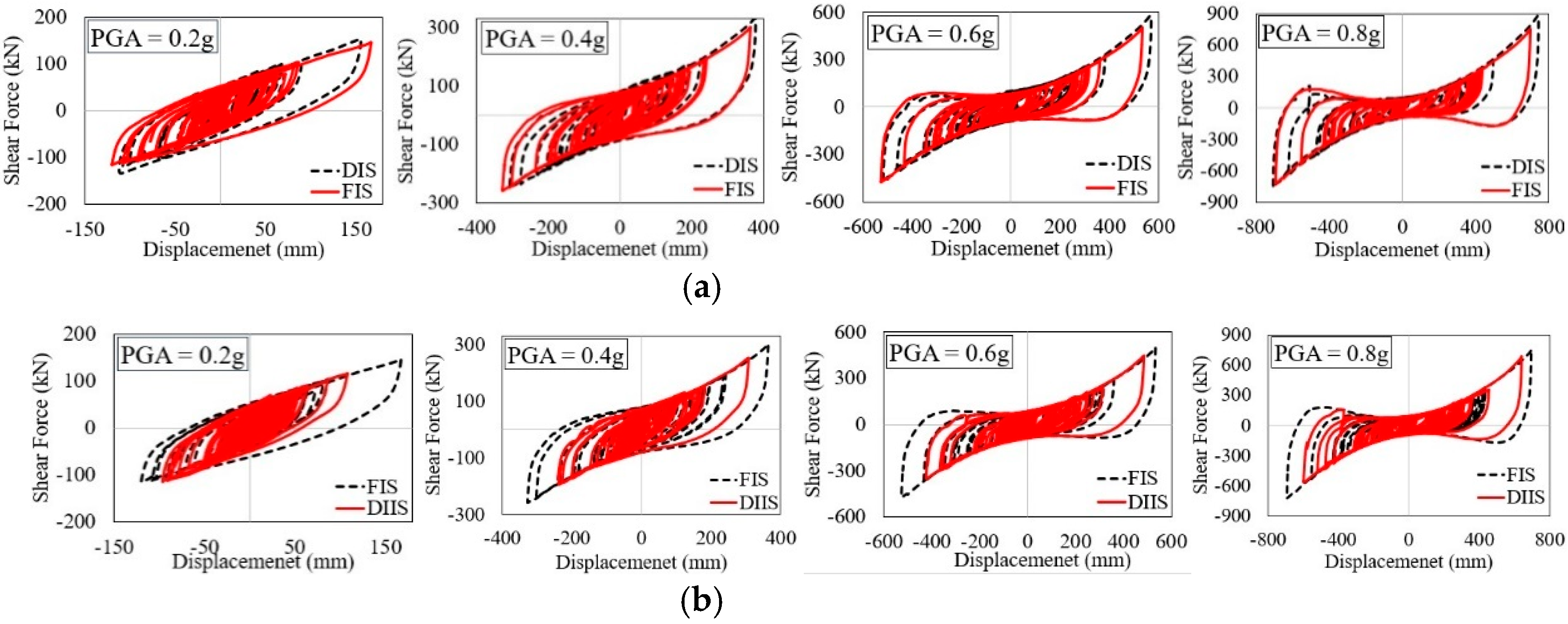 - The HDRBs exhibited consistent hysteresis behavior and proficient energy dissipation at different earthquake intensities. Buildings with HDRBs experienced significantly reduced story shear forces, ranging from 90% to 100% compared to non-isolated structures. This demonstrates the ability of HDRBs to absorb substantial seismic energy without permanent deformation, thereby enhancing the structural resilience of flat-plane and split-foundation structures.