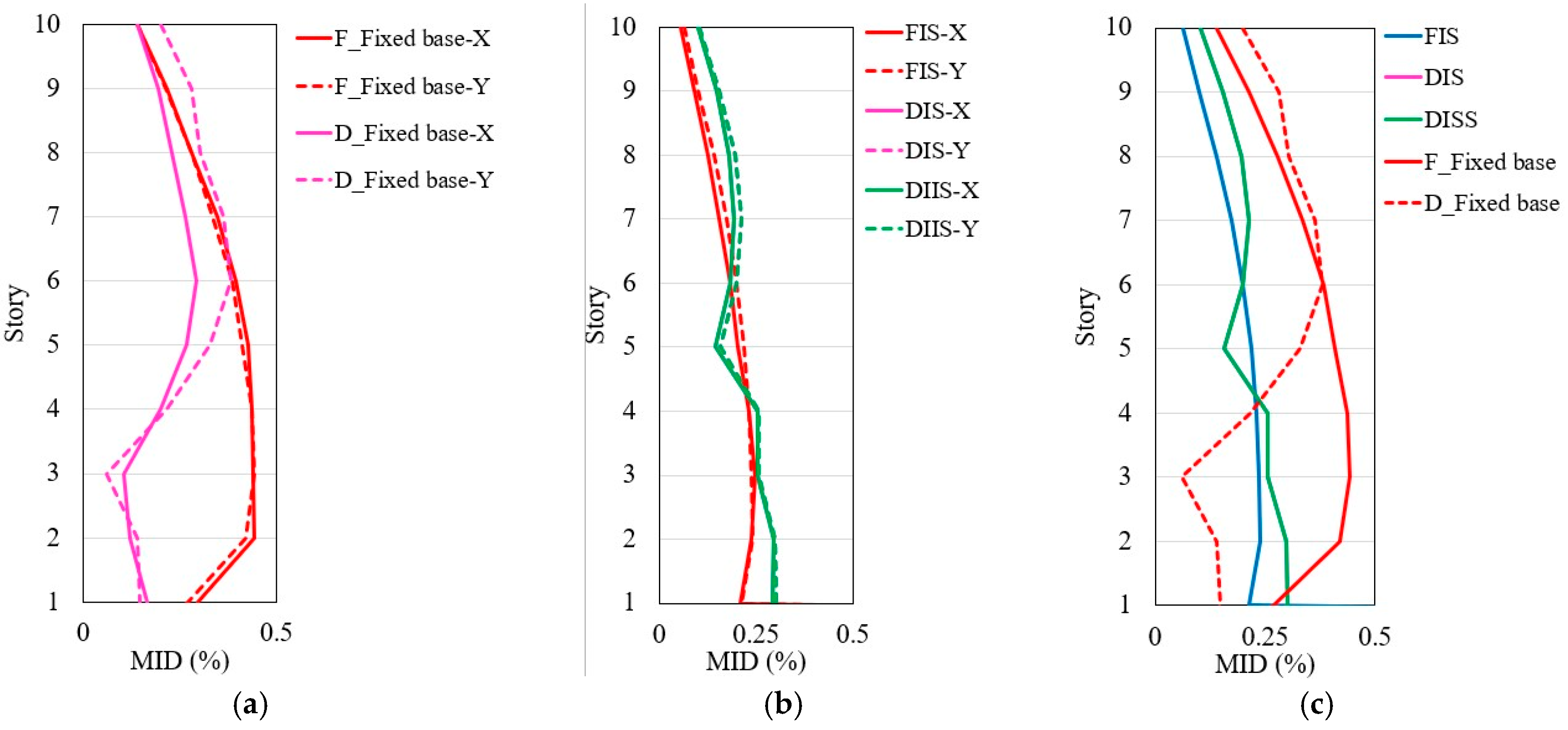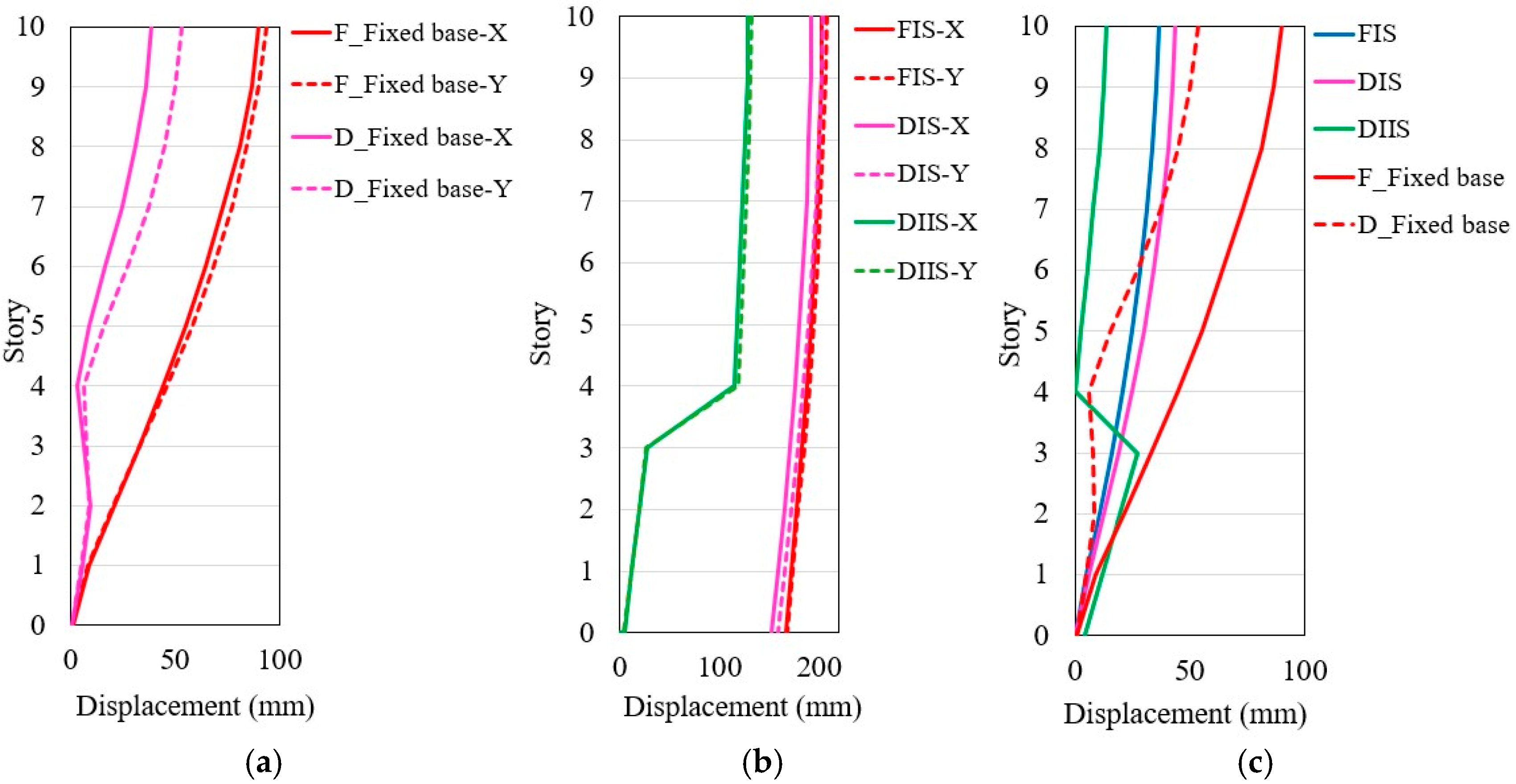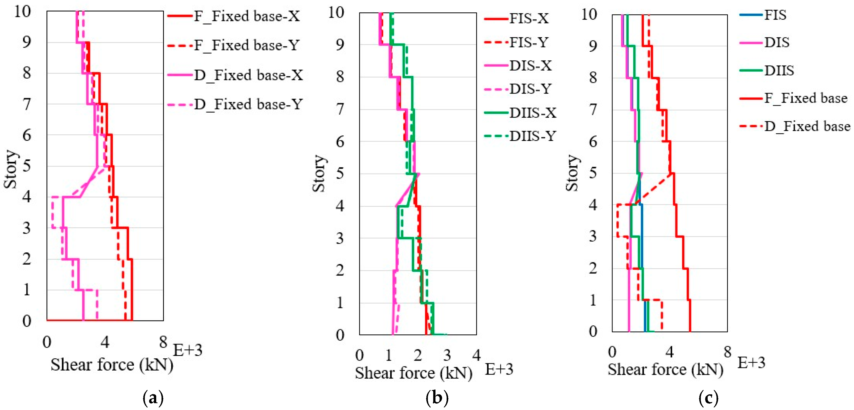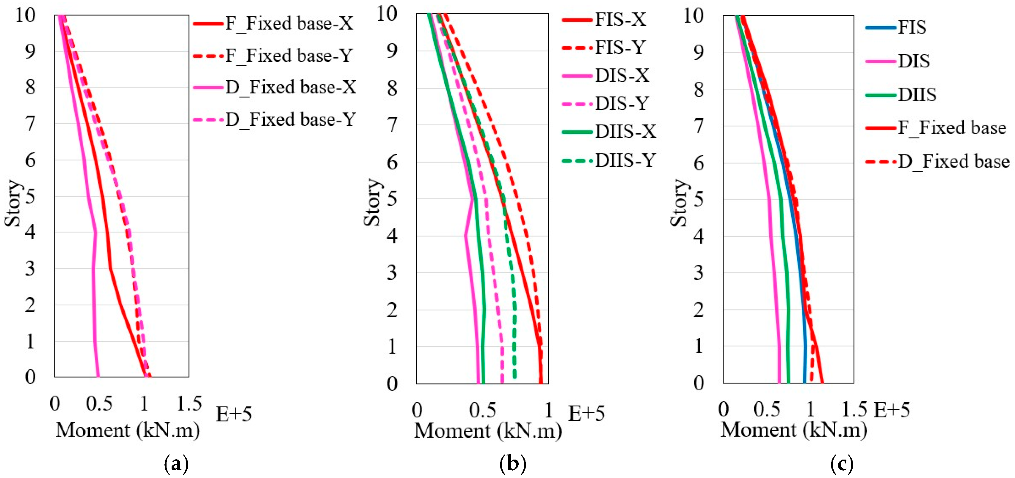 - Base isolation effectively reduced the overturning moments in both the X- and Y-directions, showing values that were much lower than those of the non-isolated models. This indicates enhanced stability and a reduced risk of structural failure or tipping during seismic activity.