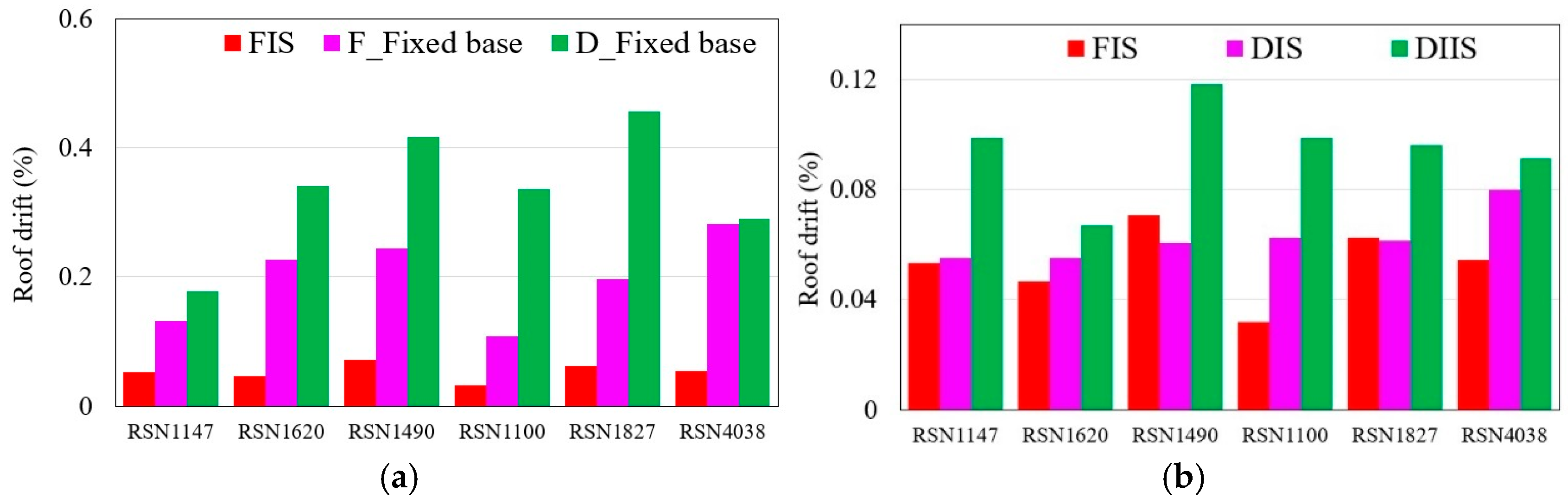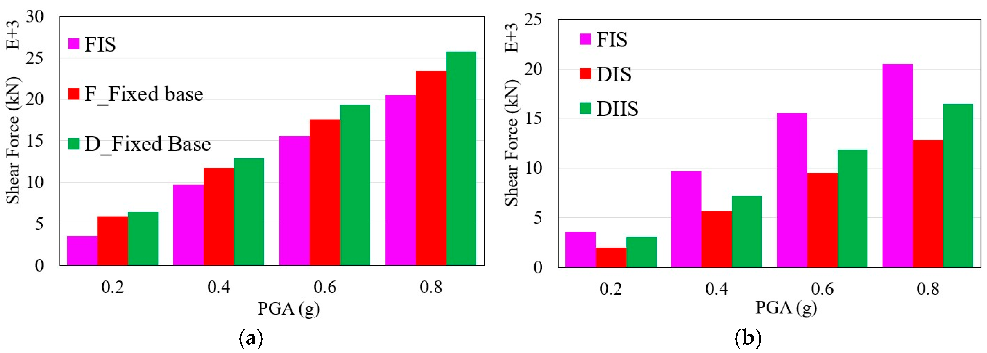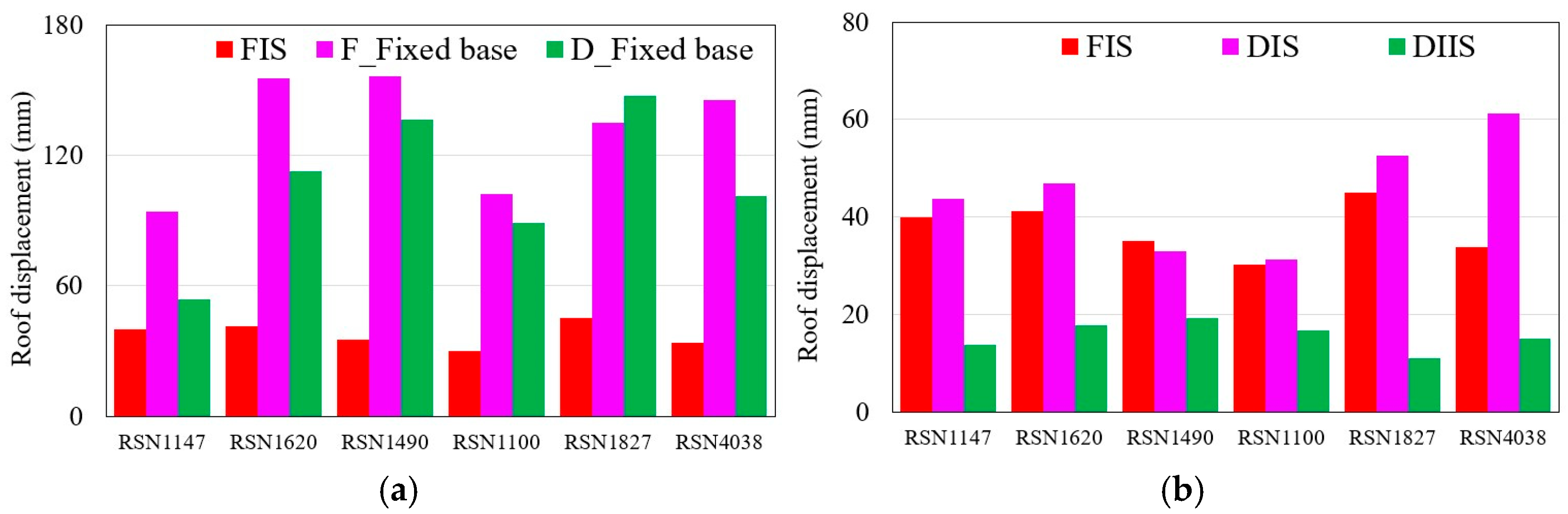 - Base isolation techniques, especially in the FIS model, led to an almost 90% decrease in the peak roof acceleration compared to fixed-base structures. The DIS and DIIS models also exhibited a considerable reduction of approximately 80%. Additionally, the DIS and DIIS models exhibited noteworthy decreases in base shear forces of 70% and 55%, respectively, compared to non-isolated split-foundation structures.