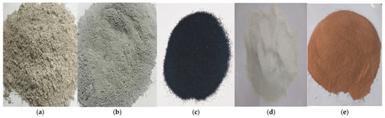 Images of the materials used. (a) Slag, (b) SF, (c) CR, (d) GW, (e) CW.