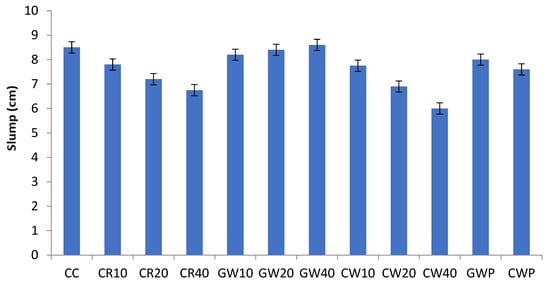 Slump of the mixes containing waste materials.