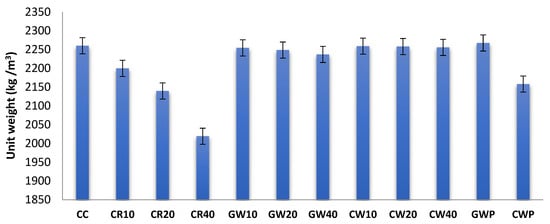 The unit weight of all HPGC mixtures was assessed using 28-day-cured compressive strength specimens, as depicted in Figure 4. The unit weights exhibited a range of 2019.1 kg/m3 to 2267.5 kg/m3. Results revealed that CW-modified mixes yielded the highest unit weight values, exceeding the CC due to the elevated water absorption characteristics of CW aggregates, which reduced pore formation during curing. Conversely, GW-incorporated mixes demonstrated unit weights comparable to the control, attributed to the lower water absorption capacity and advantageous particle morphology of GW. Notably, a 10% GW substitution for quartz sand exhibited negligible impact on unit weight. In contrast, CR integration reduced unit weight significantly, a consequence of the inherently low density and hydrophobic properties of rubber particles, which increased void content (after free water evaporation) within the matrix and hence lowered unit weight.