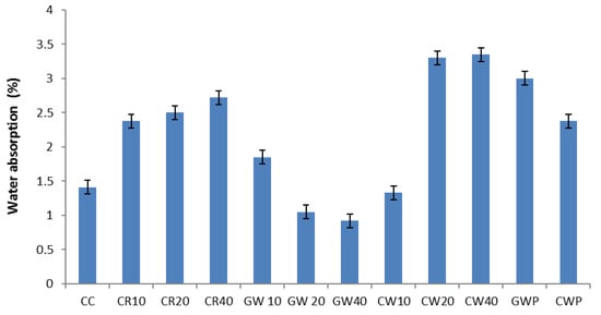 CW-modified HPGC exhibited WA values spanning 1.33% to 3.35%, with the control mix (1.68%) demonstrating the lowest absorption. GW outperformed both CR and CW, achieving the minimal WA across all substitution levels. A 10% GW replacement yielded a WA of 1.85%, with further increments reducing absorption by ~66%, attributable to GW’s low porosity and enhanced particle packing.