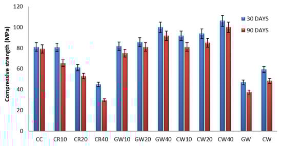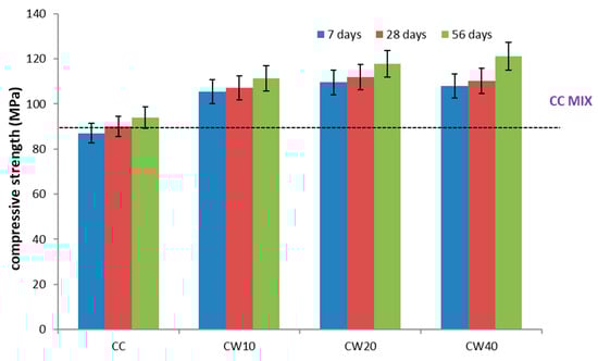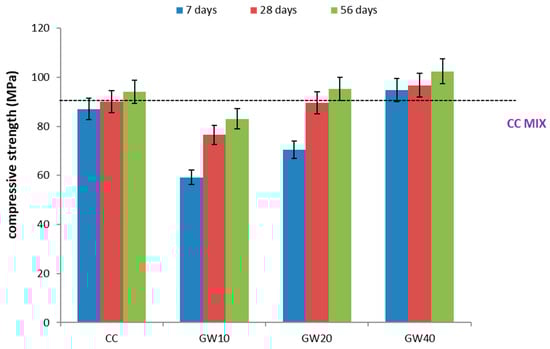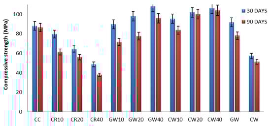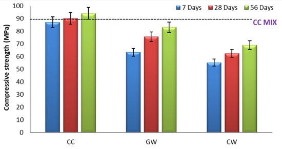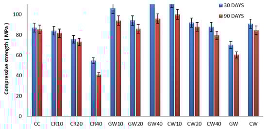 Compressive strength of HPGC mixes with different ratios of CW.