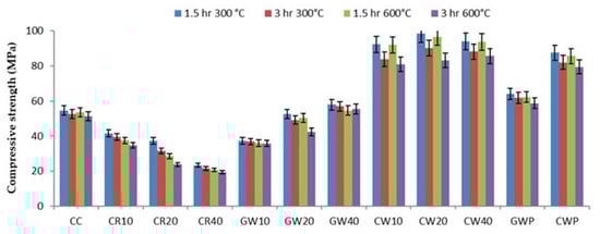 The thermal performance of HPGC is a critical determinant of its structural resilience in fire-prone or high-temperature environments. This investigation analyzes the residual compressive strength of HPGC formulations incorporating CR, CW, and GW as partial/full substitutes for conventional aggregates, following exposure to 300 °C and 600 °C for 1.5 and 3.0 h (Figure 10). Results revealed no linear correlation between heating duration and residual compressive strength, with variability attributed to the heterogeneous thermal response of waste-modified matrices.