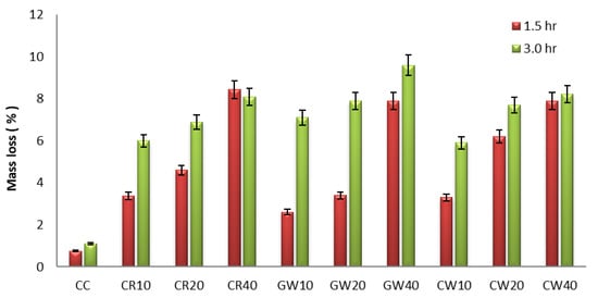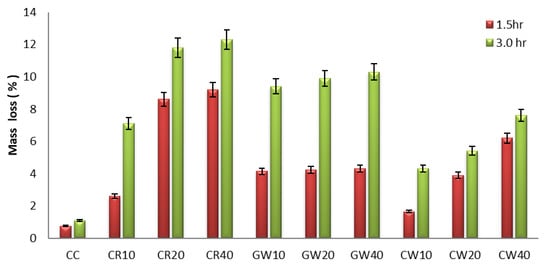 Mass loss of HPGC mixes at 300 °C for 1.5 h and 3.0 h.