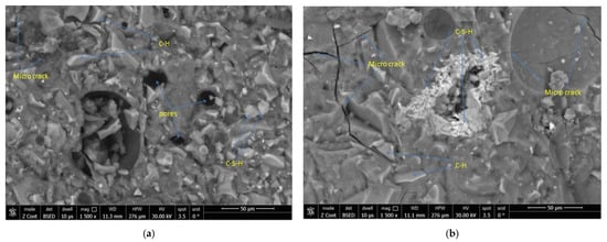 The microstructural features correlate directly with the mechanical and durability properties of HPGC. Figure 13a illustrates the microstructure of GC containing 10% SF, 90% FA, and aggregates of 20% CR and 80% quartz sand. The matrix exhibits a heterogeneous morphology with calcium–silicate–hydrate (C-S-H) gel and calcium hydroxide (C-H) crystals, indicative of partial pozzolanic reactions between SF and residual calcium from FA. Pores, likely formed due to CR incorporation and water evaporation during curing, reduce mechanical strength but may enhance thermal insulation. Microcracks near CR particles and within the matrix suggest shrinkage stresses or weak interfacial bonding, exacerbated by thermal mismatch between rubber and the geopolymer paste. While the use of CR aligns with sustainable practices, the porous and fractured microstructure underscores the need for optimizing interfacial adhesion and curing conditions to improve durability.