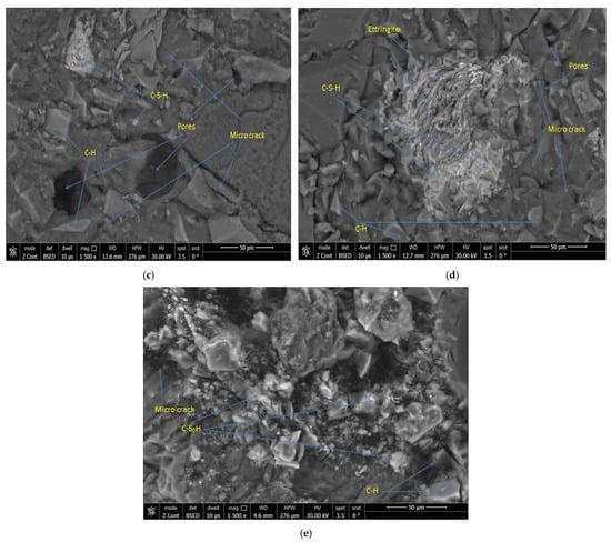 Figure 13e (10% CW, 90% FA, 100% quartz sand) demonstrates concurrent hydration and geopolymerization, evidenced by C-S-H and C-H phases. Microcracks, likely from shrinkage or thermal stresses, propagate along CW–matrix interfaces, underscoring interfacial incompatibility. Despite these flaws, the rough CW texture enhances load transfer, suggesting that tailored curing conditions (e.g., controlled humidity) could minimize cracking while preserving sustainability advantages.