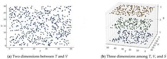 S), further confirming that the sampling strategy achieves excellent space-filling properties across both continuous and discrete variables. The stratified, layered pattern in the third dimension reflects the inclusion of all three typical icing shapes, with samples in each layer uniformly spread over the full range of