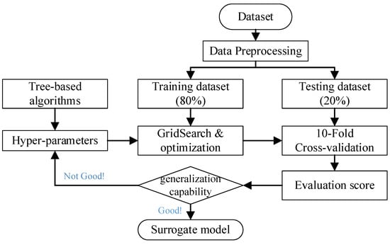 Figure 7. After data preprocessing, the dataset was randomly divided into training and testing subsets at a ratio of 4:1, ensuring that the model’s evaluation would be based on previously unseen data and thus provide a reliable assessment of its generalization capability. The training set (80%) was utilized to construct and tune the tree-based surrogate models, with a focus on the XGBoost algorithm due to its superior performance in preliminary comparisons.
