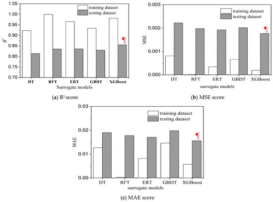 (1) Among the five evaluated tree-based surrogate models (DT, RF, ERT, GBDT, and XGBoost), the XGBoost-based model consistently achieved the highest predictive accuracy and strongest generalization capability. This was evidenced by its superior R2 values and lower MSE and MAE on the testing dataset, indicating a balanced trade-off between fitting precision and robustness.
