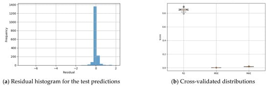 Figure 10a, the residual histogram indicates that prediction errors are highly concentrated around zero, with only a few deviations on the negative side, suggesting that the model exhibits low bias and good overall calibration.
