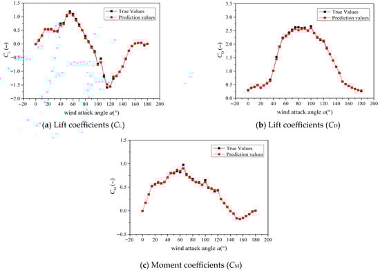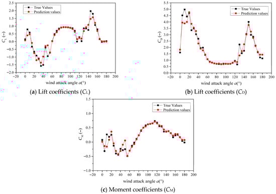 Across the entire range of a from 0° to 180°, the predicted curves (red dots) closely follow the measured true values (black squares), accurately reproducing both the amplitude and phase of the aerodynamic coefficient variations. Minor local deviations are observed at certain angles, particularly near peak and valley regions, which may be attributed to local flow separation complexities not fully captured in the training data. Nonetheless, the overall agreement remains high, with the surrogate model successfully capturing the key aerodynamic features under different icing shapes and wind speeds.
