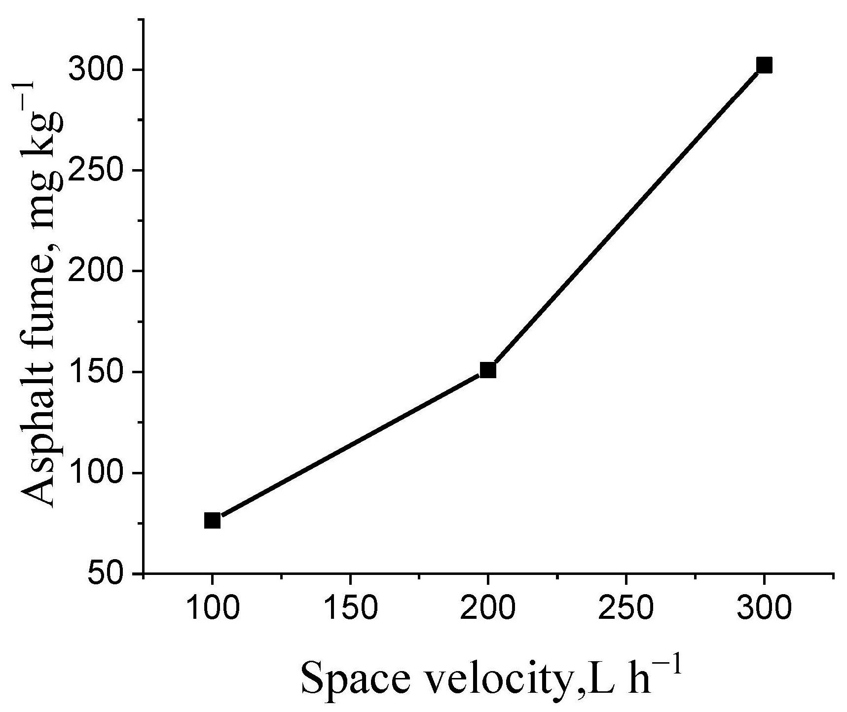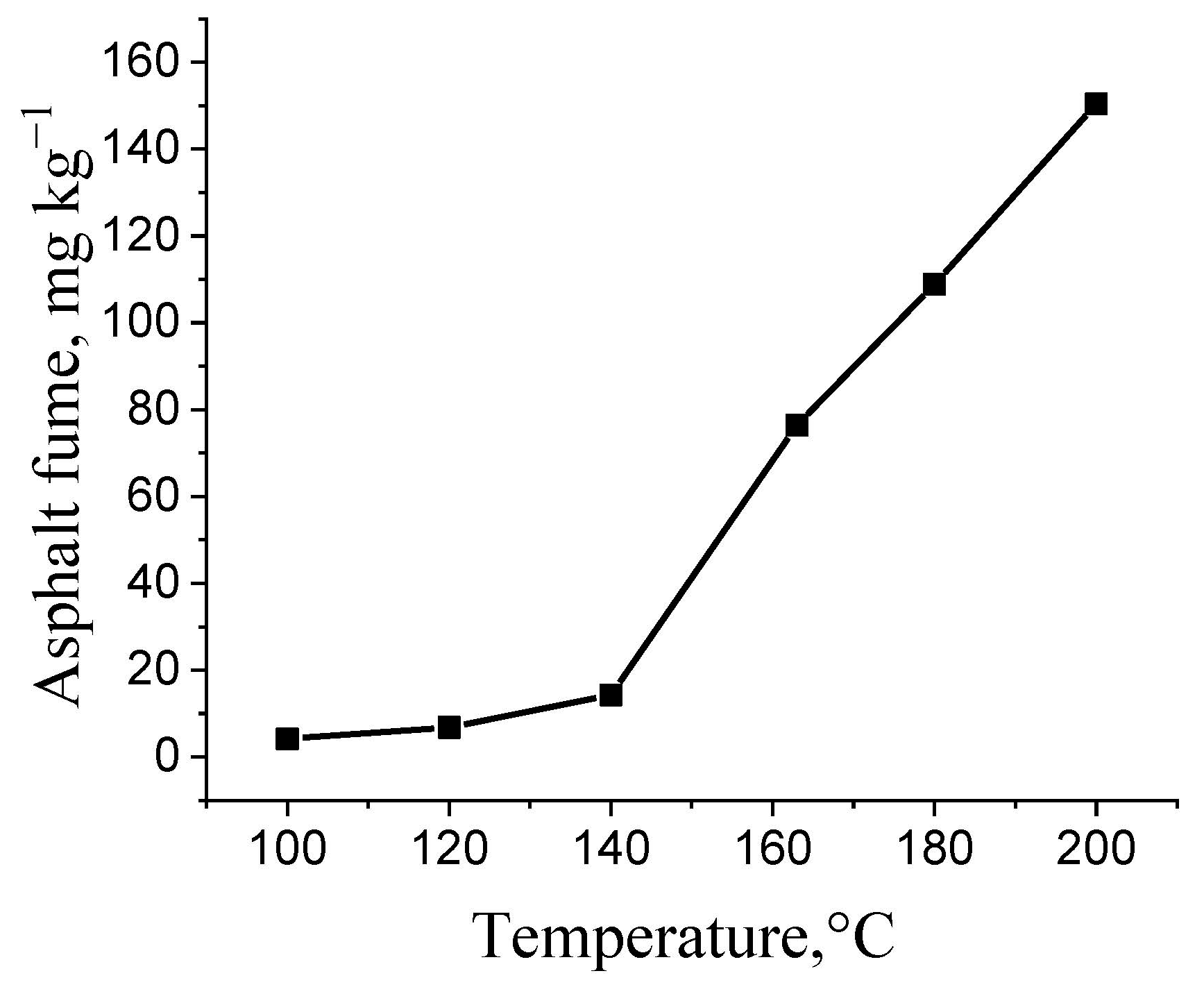 - Li, C.; Wang, J.; Zhang, H.; Liu, Y. Temperature threshold characteristics of fume generation in SBS-modified asphalt based on closed-loop test system. China J. Highw. Transp. 2021, 34, 45–53. [Google Scholar] [CrossRef]