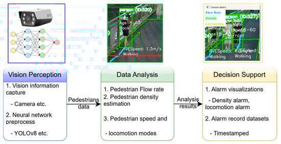 The pedestrian management system architecture. Vision Perception (capturing and preprocessing data), Data Analysis (calculating pedestrian flow, density, speed), and Decision Support (providing alarm visualizations and timestamped records for further actions). The colored circles in Vision Perception schematically represent different conceptual layers of the neural network processing pipeline.