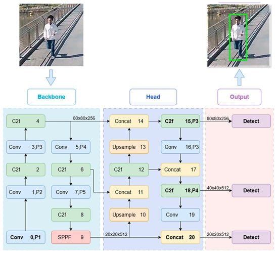 YOLO [35] is a deep learning-based object detection architecture, conducts comprehensive image analysis to achieve real-time object detection. The YOLOv8 iteration improves object recognition accuracy and system robustness through its backbone network incorporating Cross Stage Partial (CSP) modules [36], as shown in Figure 2. ByteTrack improves upon conventional SORT and DeepSORT methods by significantly enhancing tracking precision and efficiency [37,38]. Integrated with YOLOv8, ByteTrack receives pedestrian detection boxes and matches corresponding targets across consecutive frames, enabling real-time pedestrian tracking on footbridges.