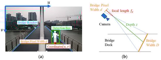 In this formula, z is the depth information (m), fx is the focal length of the camera in the x-direction (px), D is the bridge deck width (m), and d(v) is the bridge deck pixel width at the pixel coordinates (u, v) in pixels (px).